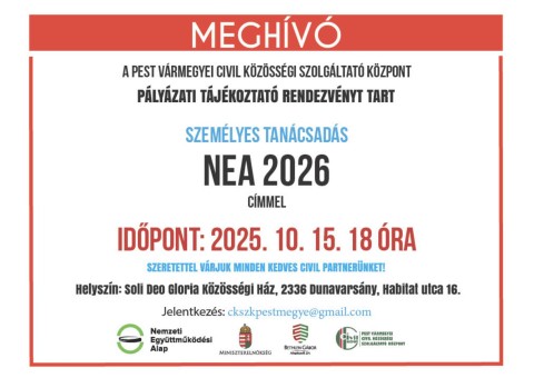 Az eseményre október 15-én 18 órától kerül sor a Soli Deo Gloria Közösségi Házban, a Habitat utca 16. szám alatt. A program célja, hogy a civil szervezetek közvetlen, személyes segítséget kapjanak a Nemzeti Együttműködési Alap 2026-os pályázataival kapcsolatban. Az érdeklődők információt kaphatnak a pályázati feltételekről és a támogatási lehetőségekről. A rendezvényen való részvétel ingyenes, de előzetes jelentkezés szükséges a cksdkpestmegye@gmail.com e-mail címen.