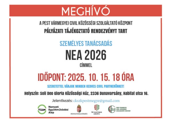 „Személyes tanácsadás NEA 2026” címmel tart tájékoztató rendezvényt a Pest Vármegyei Civil Közösségi Szolgáltató Központ Dunavarsányban.
