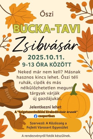 A már hagyományossá vált esemény őszi alkalmát október 11-én, szombaton, reggel 9 és délután 1 óra között tartják a Bucka tónál. Gyurcsik József, a Közösség a Fejlett Városért Egyesület elnöke rádiónknak elmondta, az őszi vásáron a gyermek- és felnőttruhák mellett kerti szerszámok, használati tárgyak, valamint régiségek is új gazdára találhatnak. Hozzátette, az árusoktól egy tálca süteményt kérnek, amelyből a vendégek és maguk az árusok is fogyaszthatnak a rendezvény ideje alatt. A szervező tájékoztatása szerint még vannak szabad asztalok, a jelentkezéseket több platformon is fogadják. Továbbá az esemény ideje alatt pokrócokat és takarókat gyűjtenek az állatmenhelyek számára. A szervező hozzátette, a Bucka tavi zsibvásár nemcsak közösségi esemény és találkozási pont, hanem minden alkalommal egy nemes ügyet is támogat. A mostani rendezvényen a hideg időszakra való felkészülésben szeretnének segítséget nyújtani a menhelyeken élő állatok számára. A felajánlásokat – legyenek azok az árusoktól vagy a vásárlóktól – egyaránt szívesen fogadják.