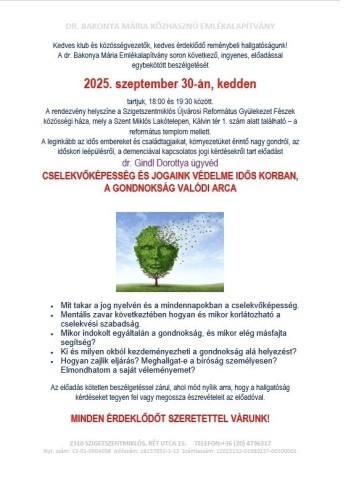 A nyári szünet után az első programot szeptember 30-án, kedden tartották, ahol a „Cselekvőképesség és jogaink védelme idős korban – a gondnokság valódi arca” című előadást hallgathatták meg az érdeklődők. Tinnyei Gáspár Kornélia, az alapítvány kommunikációs munkatársa rádiónknak elmondta, minden alkalommal fontosnak tartják, hogy a rendezvények minden korosztály számára hasznosak legyenek. Ezúttal elsősorban az időseket és családtagjaikat érintő kérdéseket vitatták meg. Hozzátette, az előadást Dr. Gindl Dorottya ügyvéd tartotta, aki az időskori leépülésről, valamint a demenciával összefüggő jogi tudnivalókról beszélt a résztvevőknek. Hangsúlyozta, a korábbi alkalmakhoz hasonlóan ezúttal is minden résztvevő kérdéseket intézhetett az előadóhoz. Kiemelte, bár nem személyre szabott formában, de átfogó tájékoztatást kaptak a jelenlévők a sokszor összetett jogi kérdésekről.