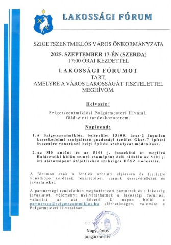 Lakossági fórumot tartottak Szigetszentmiklóson szeptember 17-én, szerdán a Polgármesteri Hivatalban. A rendezvényen két témáról tájékoztatták a megjelenteket, és lehetőség volt kérdések feltevésére is. Az első napirendi pont a Szigetszentmiklós belterületén található, 13400-as helyrajzi számú ingatlanra vonatkozott, amely a Gksz-7 építési övezetben fekszik, és ahol az új Tesco logisztikai központ épült. Ladányi Sándor, az Egységben a Városért Egyesület frakcióvezetője rádiónknak elmondta, a fórumon a résztvevők megnyugtató válaszokat kaptak a Tesco képviselőjétől, mivel a működésből nem várható környezetszennyezés, és a reggeli, illetve délutáni csúcsidőszakban forgalomnövekedés sem lesz. A szeptember 17-i szigetszentmiklósi lakossági fórum második napirendi pontja a közlekedés fejlesztéséről szólt. A résztvevők az M0 autóút és az 5101-es összekötő út halásztelki, külön szintű csomópontjának déli oldalán tervezett alcsomópont átépítéséhez szükséges Helyi Építési Szabályzat módosításáról kaptak tájékoztatást. Ladányi Sándor, az Egységben a Városért Egyesület frakcióvezetője hozzátette, a csomópont kialakítása nagyban megkönnyítené a térségben közlekedők mindennapjait. Kiemelte, a tájékoztatóból kiderült, a fejlesztés jelenleg a tervezési szakaszban tart, a kivitelezés pontos időpontja egyelőre nem ismert.