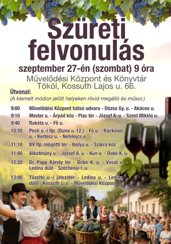 A program szeptember 27-én, szombaton  9 órakor indul a Művelődési Központtól. A menet a város több pontját is érinti: a Mester utcától a Piac téren át, a Rakéta utcán és a Pesti úti lakótelepen keresztül a főbb tereket és utcákat járja be. A kiemelt állomásokon rövid megálló és műsor várja az érdeklődőket. Déltájban a Dr. Papp Károly térnél folytatódik a program, majd a Ledina dűlőn keresztül tér vissza a városközpontba. A felvonulás zárása 13 órakor lesz, amikor a menet a Tűzoltó utcai játszótérről indulva a Művelődési Központnál ér véget.